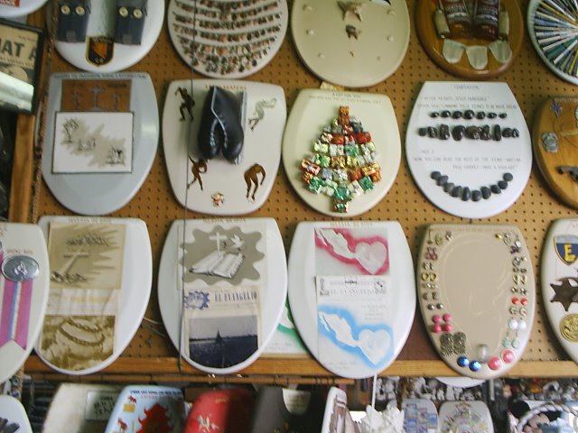 Covering every inch of the museum's walls and even hanging from the rafters are toilet seats and lids decorated with all manner of mixed media (save fecal matter, thankfully). Smith was inspired by his father (also a master plumber) who had a penchant for mounting plaques and trophies. Smith noticed a similarity between the mounting boards and the toilet seats he worked with every day, and soon began collecting used seats that he would then paint or adorn with bright trinkets.